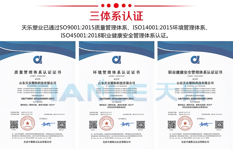 天樂塑業公司通過ISO質量管理體系、環境管理體系、職業健康安全管理體系認證,AAA企業信用等級認證。
